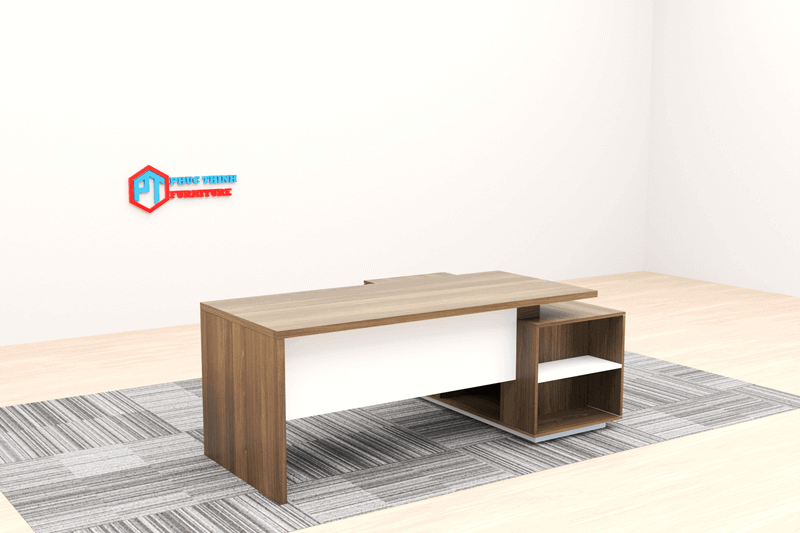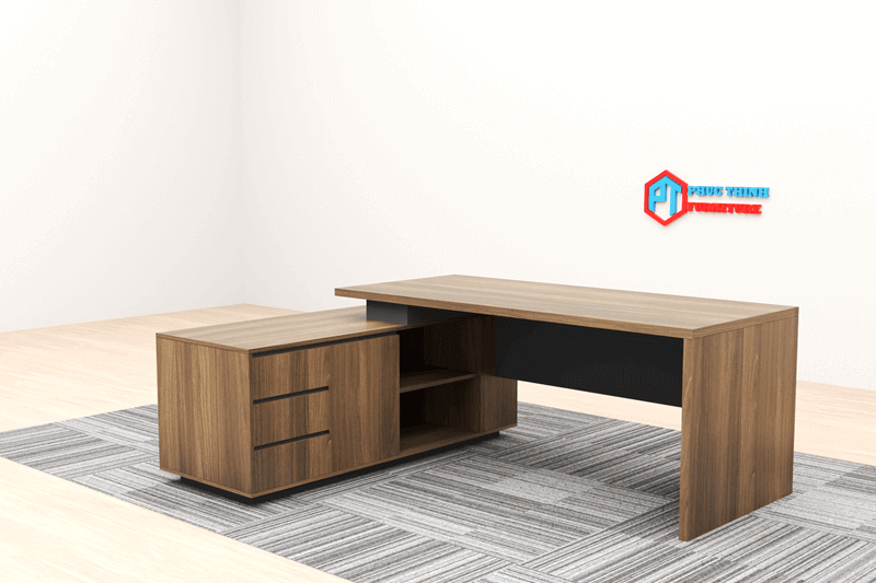 Kích thước 1800x800 + 1600x400 Chất liệu Gỗ Mdf phủ melamine. Màu sắc Quý khách tùy chọn màu Phụ kiện Bản lề giảm chấn, ổ khóa cánh tủ Giao hàng Sau 2-5 ngày đặt hàng Bảo hành 12 tháng Bàn giám đốc BGDPT 20 thiết kế nâu vân gỗ xen kẽ với ghi trầm, sang trọng mà tối giản, chuyên nghiệp. Sản phẩm được gia công tỉ mỉ, khéo léo, các chi tiết hài hòa, tôn lên phong thái làm việc chuyên nghiệp của nhà lãnh đạo.
