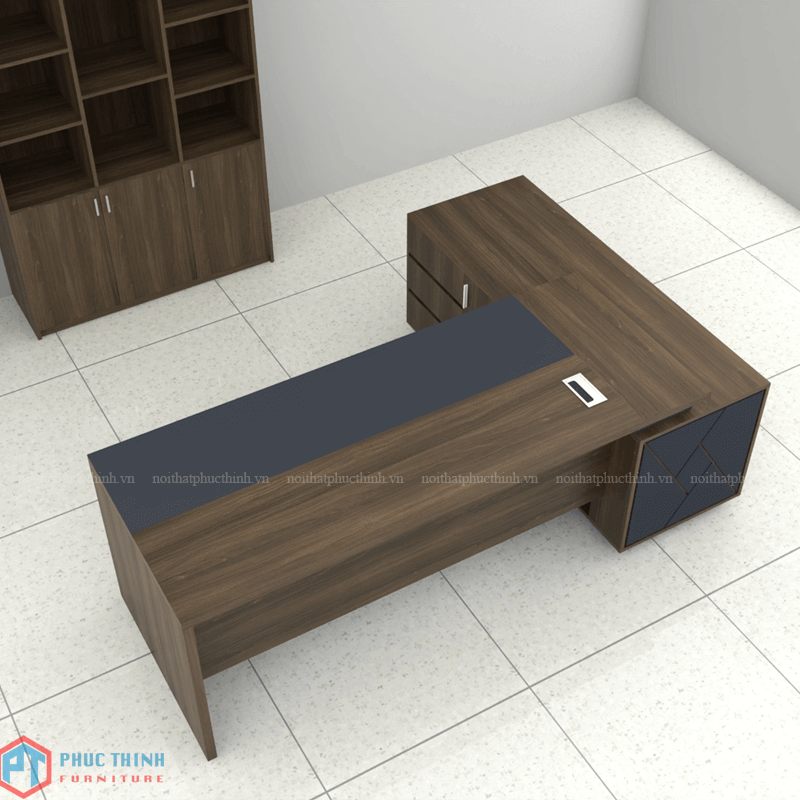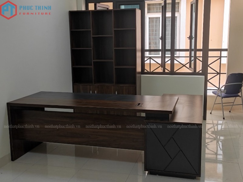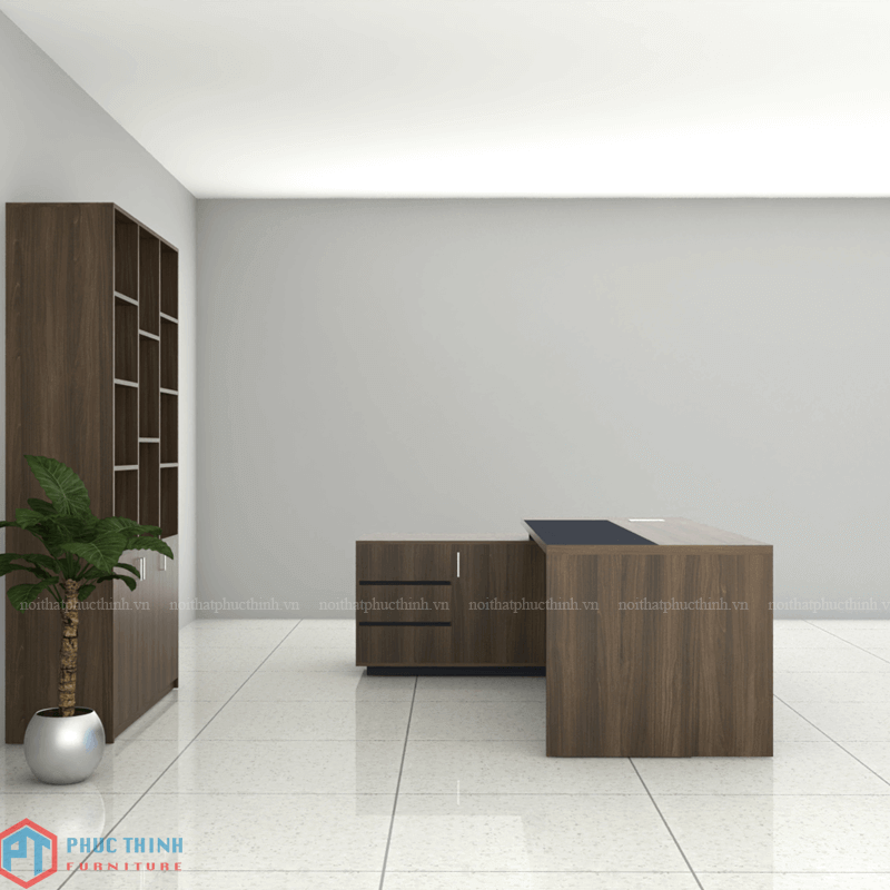 Bàn giám đốc BGDPT 22 rộng rãi, tông nâu trầm sang trọng, phù hợp cho môi trường làm việc chuyên nghiệp, hiện đại. Sản phẩm làm từ chất liệu MFC phủ Melamine có độ bền và tĩnh thẩm mĩ cao, chống được mối mọt, ẩm mốc, trầy xước.