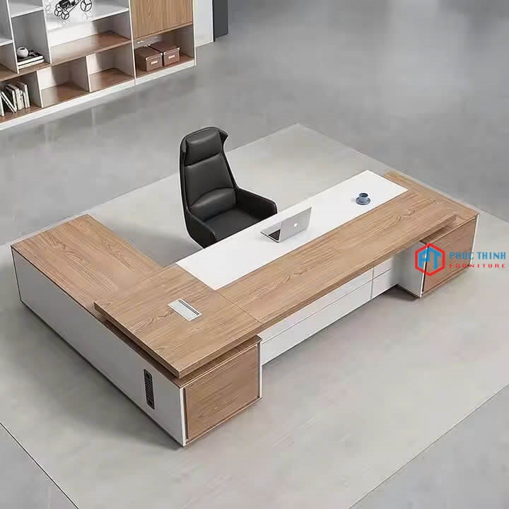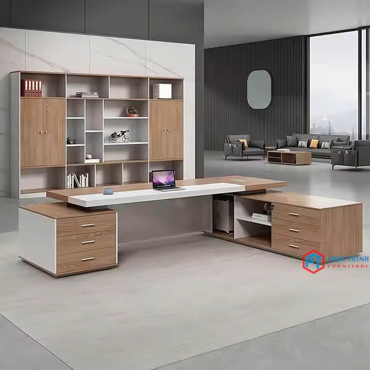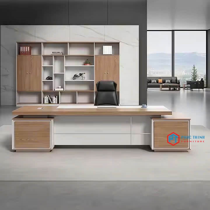 Mẫu bàn giám đốc chân chữ C độc đáo, mặt bàn phủ melamine trắng kết hợp tủ phụ đôi bên tiện lợi. Thiết kế hiện đại, phù hợp cho các văn phòng yêu cầu sự sáng tạo và phá cách.