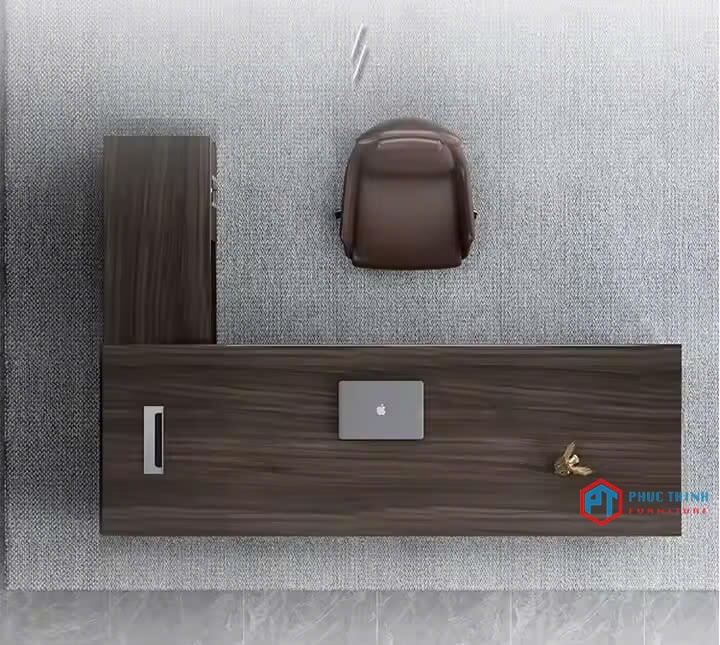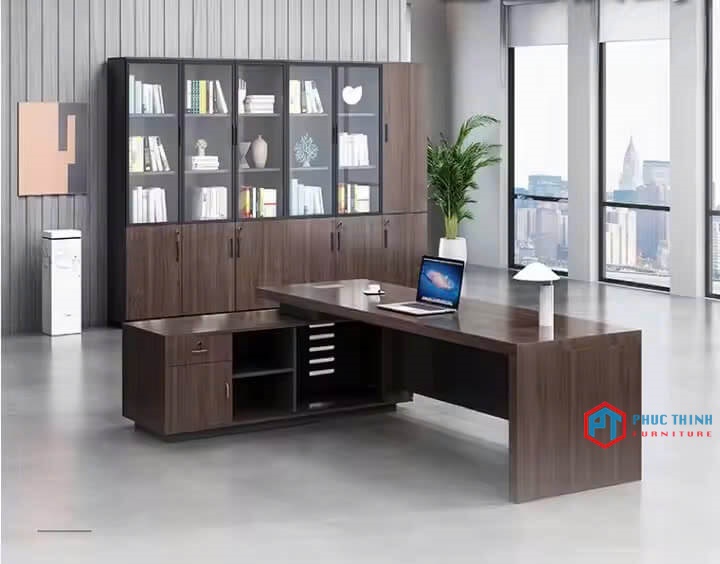 Mẫu bàn giám đốc gỗ công nghiệp màu nâu trầm, thiết kế hình khối chắc chắn, đi kèm tủ phụ và hệ tủ kính sau lưng để lưu trữ hồ sơ hoặc trưng bày đồ trang trí. Phù hợp với không gian sang trọng, kín đáo.