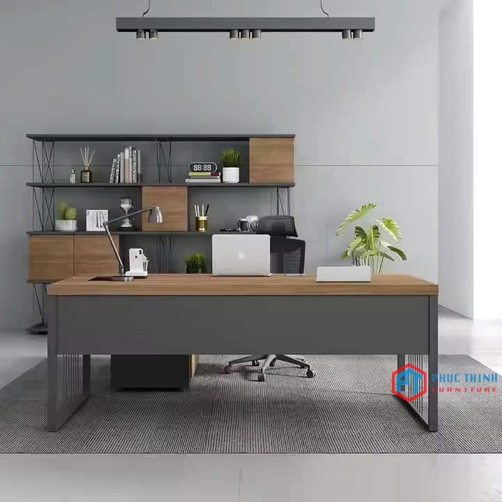 Mẫu bàn giám đốc thiết kế theo phong cách công nghiệp, sử dụng tone xám và gỗ tự nhiên tạo nên sự độc đáo và mạnh mẽ. Hệ kệ trang trí phía sau được thiết kế dạng mở, linh hoạt, thể hiện phong cách trẻ trung.