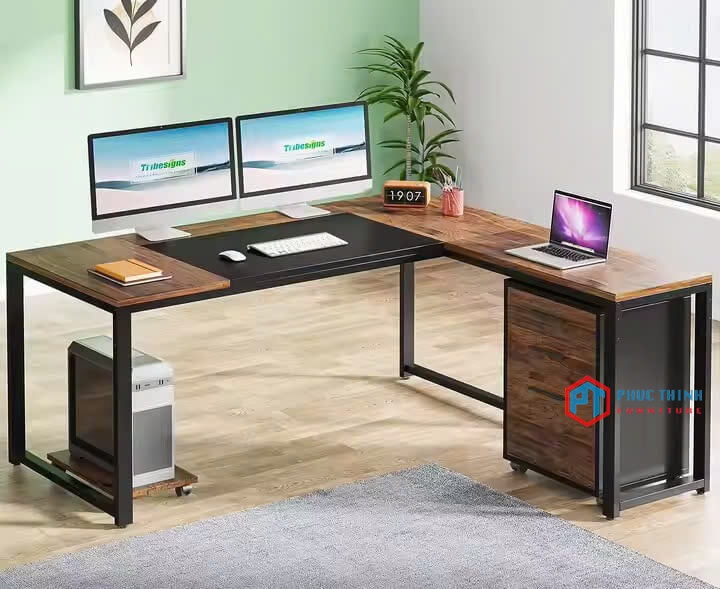 Bàn làm việc chữ L phối gỗ sẫm sang trọng, thiết kế khung sắt vuông chắc chắn, đi kèm hộc tủ di động tiện lợi. Bố trí hợp lý cho góc văn phòng nhỏ gọn hoặc không gian làm việc riêng tư tại nhà, hỗ trợ setup 2–3 màn hình máy tính.