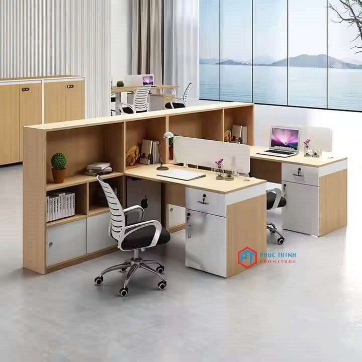 Mẫu bàn làm việc hiện đại, thiết kế module kết hợp vách ngăn, kệ để đồ và tủ tài liệu liền bàn, giúp văn phòng thêm gọn gàng và chuyên nghiệp.