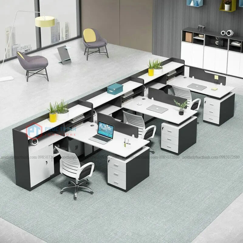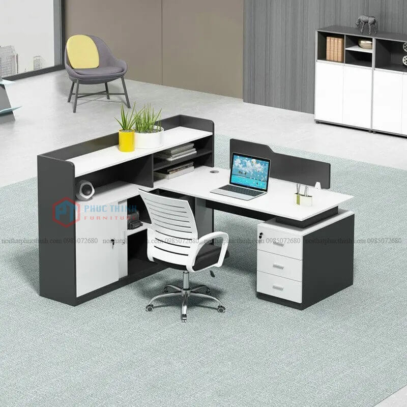 Kích thước 1500x1400x750 Chất liệu Gỗ Mdf phủ melamine Kiểu Bàn làm việc module/ Bàn làm việc liền tủ Màu sắc Quý khách tùy chọn màu Phụ kiện Bản lề giảm chấn, ổ khóa Giao hàng Sau 2-5 ngày đặt hàng Bảo hành 12 tháng Bàn làm việc liền tủ BLVPT 09 có thể xếp như bàn đơn, bàn cụm 2, bàn cụm 3.....tùy ý khách hàng
