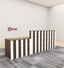Kích thước 2400x1200x750-1050 Chất liệu Gỗ Mdf phủ melamine. Màu sắc Quý khách tùy chọn màu Phụ kiện Nắp nhựa mặt bàn Giao hàng Sau 2-5 ngày đặt hàng Bảo hành 12 tháng Bàn lễ tân BLTPT 02 thiết kế bắt mắt, kẻ sọc tông nâu - trắng hiện đại, trẻ trung, góp phần tạo nên ấn tượng tốt nhất cho khách hàng. Chất liệu cao cấp, chống mối mọt, ẩm mốc, trầy xước hiệu quả