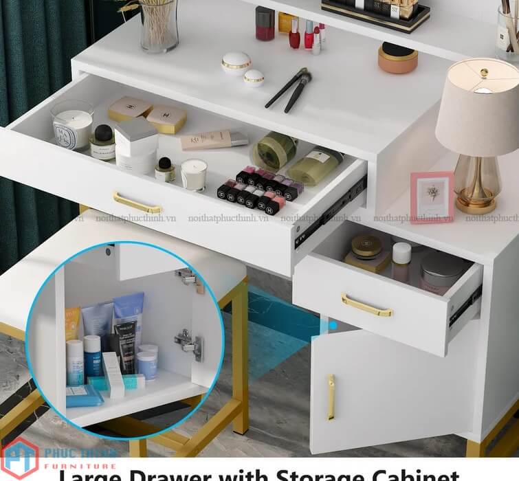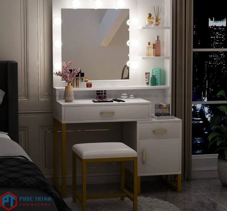 Bàn trang điểm BMPT 07 thiết kế sang trọng, đẹp mắt với tông trắng thanh lịch xen vàng cổ điển càng làm không gian phòng ngủ trở nên hài hòa, dễ chịu. Ngăn kéo, các kệ kích thước rộng rãi, tích hợp tủ phụ đi kèm, Tất cả các chi tiết đều tích hợp tay nắm chắc chắn. Ghế ngồi đệm dày, thoải mái dễ chịu.