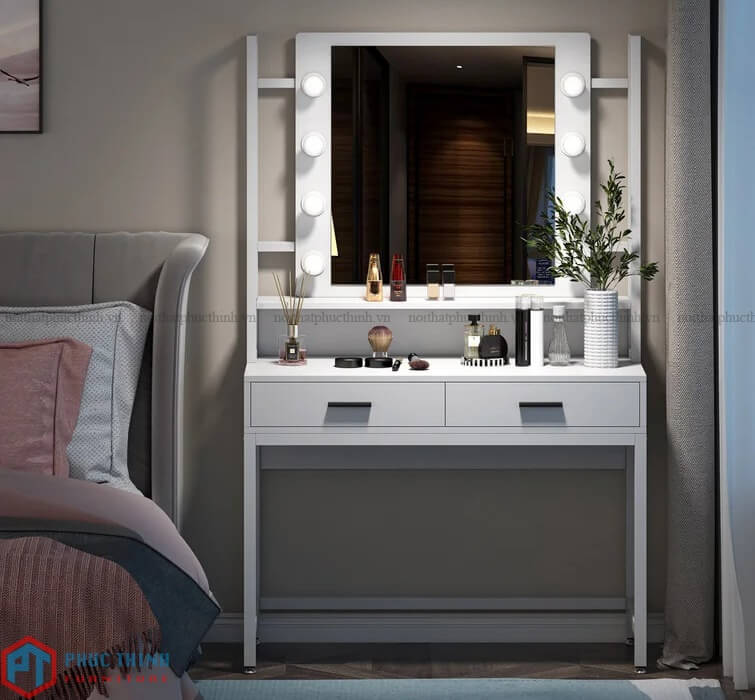 Bàn trang điểm BMPT 08 thiết kế nhẹ nhàng, thanh lịch. Chất liệu gỗ cao cấp cùng lớp sơn trắng sáng không chỉ giúp sản phẩm chống mối mọt, trầy xước, ẩm mốc mà còn tôn lên vẻ đẹp hiện đại, thời thượng. Hai ngăn kéo rộng rãi, tay nắm, chân bàn chắc chắn.