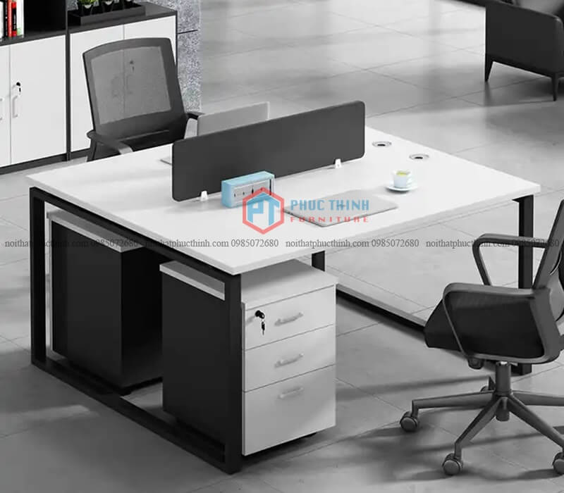 Cụm bàn làm việc 2 người CUMPT 12 là mẫu bàn thiết kế đơn giản, kết hợp chân sắt sơn tĩnh điện và mặt gỗ MFC phủ melamine. Bàn có vách ngăn bằng gỗ.