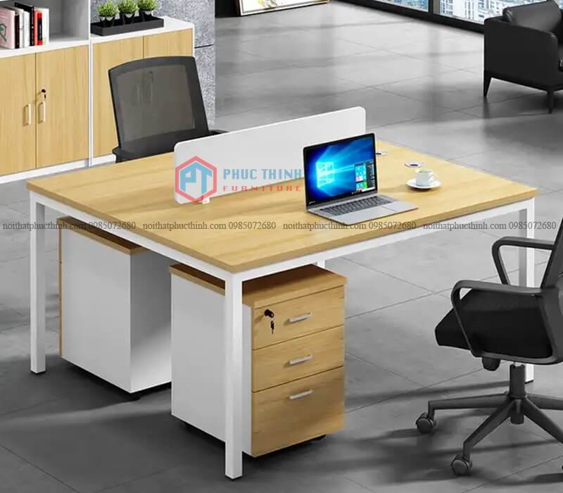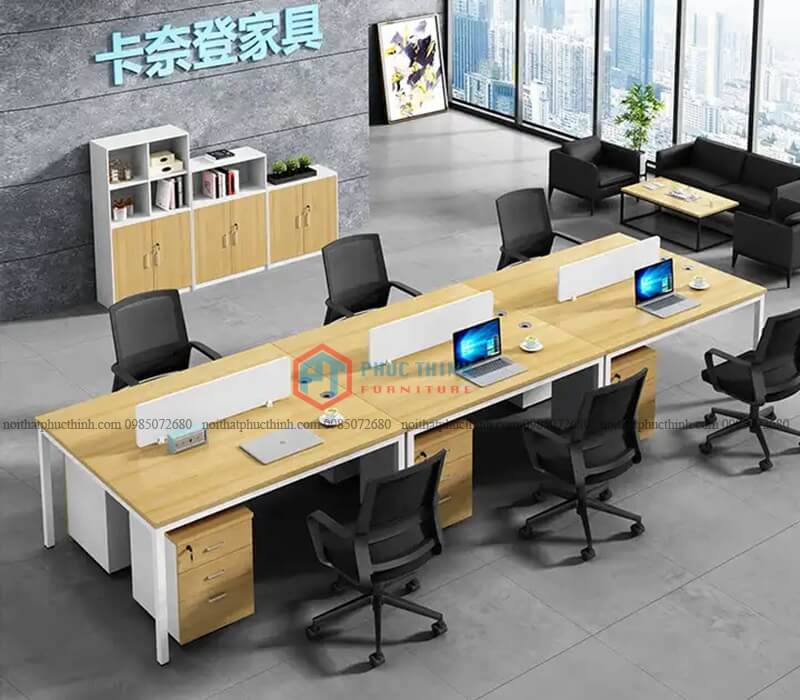 Cụm bàn làm việc chân sắt 4 người CUMPT 15 dành cho 4 người, có vách ngăn gỗ, thiết kế rộng rãi. Tông vân gỗ sáng màu đem cảm giác tươi mới cho không gia văn phòng. Chân sắt sơn tĩnh điện, mặt bàn làm từ gỗ MFC phủ Melamine chống mối mọt, ẩm mốc, trầy xước.