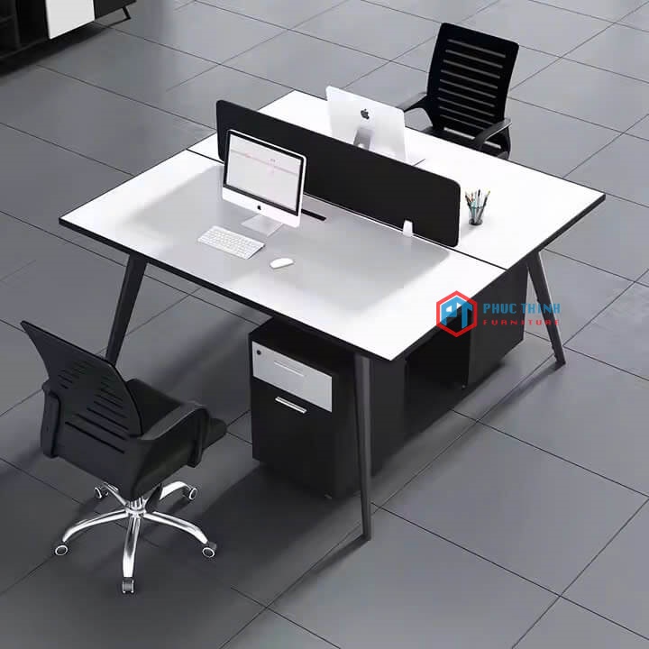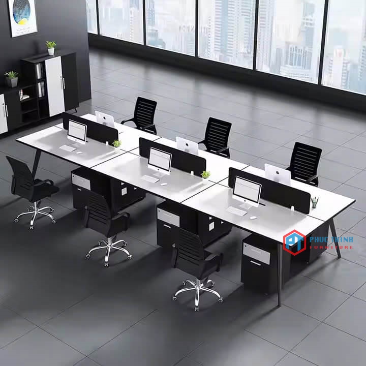 Mẫu cụm bàn làm việc 4 chỗ thiết kế hiện đại, phối màu trắng – đen tinh tế, chân sắt vát chữ A chắc chắn. Sản phẩm phù hợp với văn phòng từ 4–12 người, giúp tiết kiệm không gian và tăng tính kết nối nhóm.