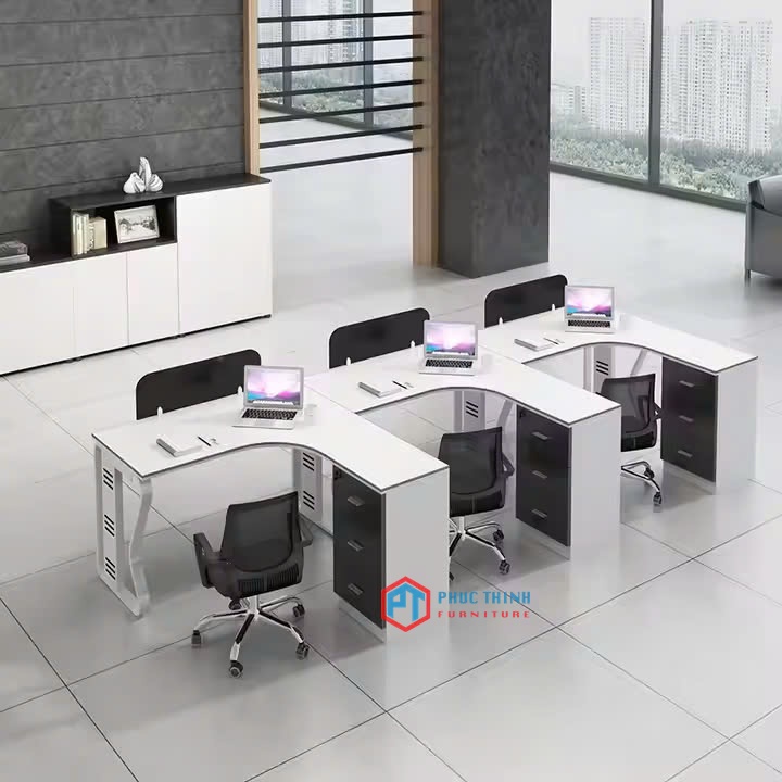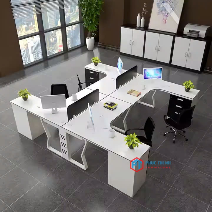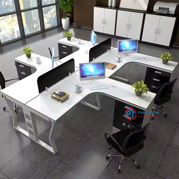Mẫu cụm bàn làm việc chữ L cho 4 người, thiết kế hiện đại với chân sắt bo cong thanh thoát và mặt bàn màu trắng sang trọng. Thiết kế dạng vòng cung giúp tăng diện tích thao tác và tạo cảm giác thoải mái khi ngồi làm việc lâu.