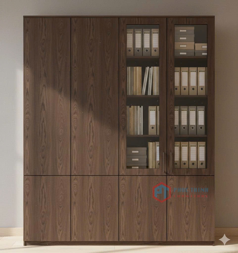 Tủ được làm từ gỗ công nghiệp cao cấp chống mối mọt, đảm bảo độ bền và tính thẩm mỹ theo thời gian. Phần kính cường lực trong suốt giúp dễ dàng quan sát tài liệu bên trong, đồng thời tạo cảm giác không gian rộng thoáng hơn.